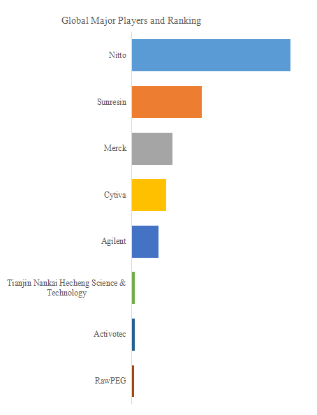 QYResearch Top Players Research Centerによると、固相合成担体の世界の主要メーカーにはNitto、Sunresinなどが含まれる。2023年、世界の上位3社の売上高シェアは約77.0%であった。