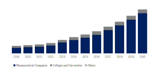 製品の用途別では、現在、製薬会社が最大のセグメントで、80.4%のシェアを占めている。