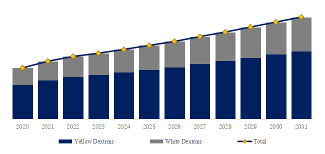 世界の黄色デキストリンおよび白色デキストリン市場規模(百万米ドル)、2020-2031年