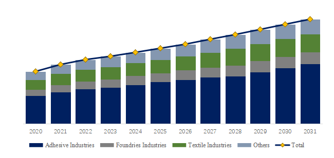 製品用途別では、現在接着剤産業が最大のセグメントであり、54.8%のシェアを占めている。