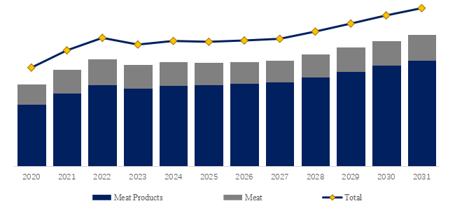 製品タイプ別では、現在「肉製品」が最大のセグメントで77.6%のシェアを占める。