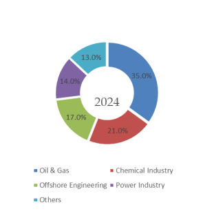 製品用途別では、現在石油・ガスが最大のセグメントであり、35.0%のシェアを占めている。