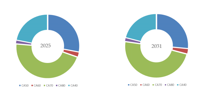製品タイプ別では、現在CA70が最大のセグメントであり、45.2%のシェアを占めている。