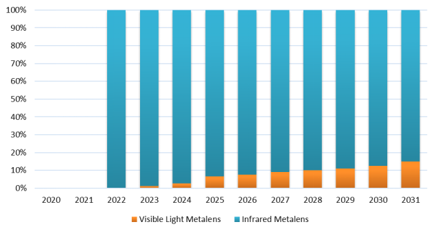 製品タイプ別では、赤外線メタレンズが最大のセグメントで97%のシェアを占めています。