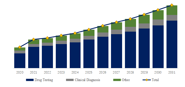 製品用途別では、現在薬物検査が最大のセグメントであり、74.4%のシェアを占めています。