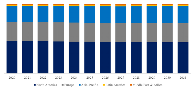 北米は世界最大のビーンバッグチェア販売地域であり、2024年の世界市場シェアは46.10%を占める。欧州は27.47%で第2位、アジア太平洋地域は23.68%を占めた。南米、中東、アフリカの市場は主に需要不足により未発達な状態が続いている。これらの地域では依然として伝統的な椅子を好む人が多く、現地企業もオフィス家具としてビーンバッグチェアを導入することに消極的である。同年、これらの地域のビーンバッグチェア市場は世界市場のわずか2.75%を占めるに留まった。