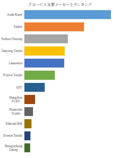 裏地生地市場は、多数の地域メーカーが競合する一方で、上位数社が確固たるシェアを維持する構造を持つ。最大手はAsahi Kaseiであり、高品質なアセテート・キュプラ裏地を中心に、グローバルブランドとの取引実績を有する。同社は素材技術と環境対応を融合させた製品群で市場をリードしている。次いでSankei、Suzhou Chuxingが続き、いずれも機能性ポリエステル裏地や特殊加工技術に強みを持つ。その他、Jianyang Textile、Lanmeiren、Weiwei Textile、QST、Hangzhou FUEN、Huameida Textile、Edmund Bell、Everest Textile、Shengyicheng Liningなどが各地域市場で一定の存在感を示している。上位プレイヤーによる品質・ブランド競争と、新興企業によるコスト競争が並行する構図の中で、製品差別化の鍵となるのは「機能性・環境性・供給安定性」である。特に欧州ブランドとの取引を拡大する企業ほど、環境認証(OEKO-TEX、GRSなど)取得が市場参入の前提条件となりつつある。
