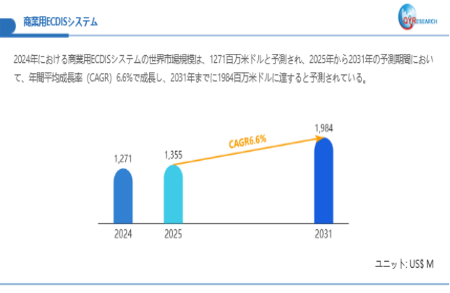 QYResearchが最新発表した「商業用ECDISシステム―グローバル市場シェアとランキング、全体の売上と需要予測、2025~2031」市場調査報告書によると、 世界の商用ECDISシステム市場規模は、2024年の約1271.30百万米ドルから2025年には1355.43万米ドルへと着実に成長し、予測期間中は年平均成長率(CAGR)6.56%で拡大を続け、2031年には1984百万米ドルに達すると見込まれている