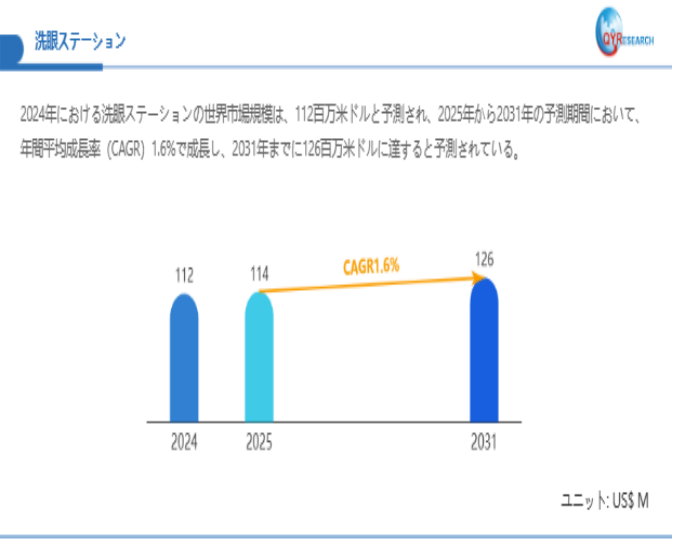 QYResearchが最新発表した「洗眼ステーション―グローバル市場シェアとランキング、全体の売上と需要予測、2025~2031」市場調査報告書によると、世界洗眼ステーション市場規模は2024年の約112百万米ドルから2025年には114百万米ドルへ着実に成長し、予測期間中に1.6%の複合年間成長率(CAGR)で拡大を続け、 2031年には126百万米ドルに達する見込みである。