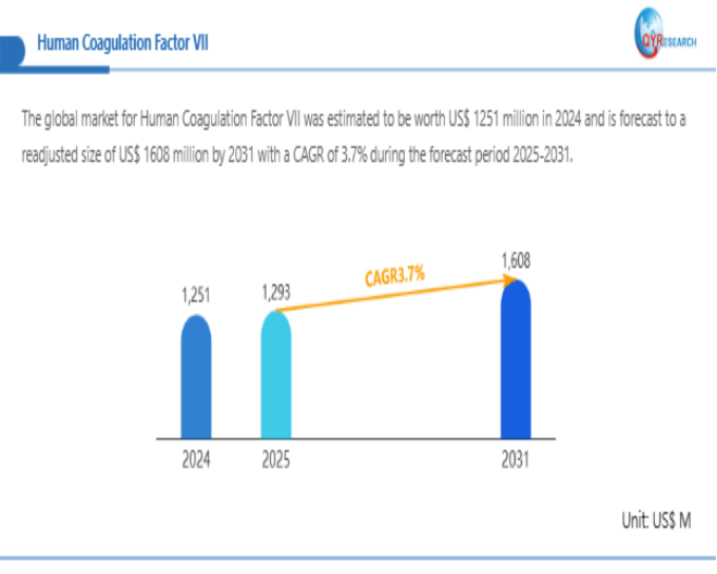 QYResearchが最新発表した「凝固因子VII―グローバル市場シェアとランキング、全体の売上と需要予測、2025~2031」市場調査報告書によると、世界凝固因子VII市場規模は2024年の約1251百万米ドルから2025年には1293百万米ドルへ着実に成長し、予測期間中に13.7%の複合年間成長率(CAGR)で拡大を続け、 2031年には1608百万米ドルに達する見込みである。