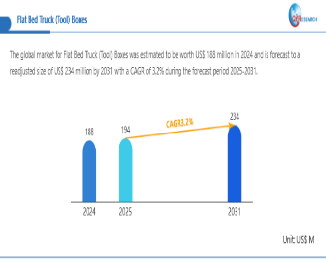 QYResearchが最新発表した「フラットベッドトラック(工具)ボックス―グローバル市場シェアとランキング、全体の売上と需要予測、2025~2031」市場調査報告書によると、世界フラットベッドトラック(工具)ボックス市場規模は2024年の約188百万米ドルから2025年には194百万米ドルへ着実に成長し、予測期間中に3.2%の複合年間成長率(CAGR)で拡大を続け、 2031年には234百万米ドルに達する見込みである。