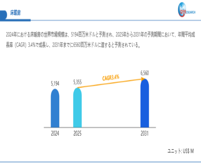 QYResearchが最新発表した「床暖房―グローバル市場シェアとランキング、全体の売上と需要予測、2026~2032」市場調査報告書によると、世界床暖房市場規模は2024年の約5194百万米ドルから2025年には5355百万米ドルへ着実に成長し、予測期間中に3.4%の複合年間成長率(CAGR)で拡大を続け、 2031年には6560百万米ドルに達する見込みである。