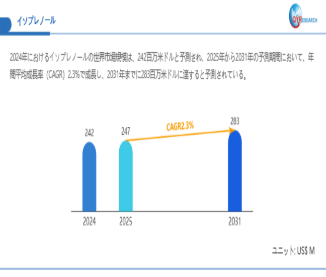 QYResearchが最新発表した「イソプレノール―グローバル市場シェアとランキング、全体の売上と需要予測、2026~2032」市場調査報告書によると、世界イソプレノール市場規模は2024年の約242百万米ドルから2025年には247百万米ドルへ着実に成長し、予測期間中に2.7%の複合年間成長率(CAGR)で拡大を続け、 2031年には283百万米ドルに達する見込みである。
