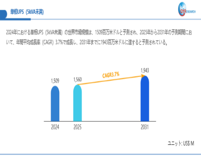 QYResearchが最新発表した「単相UPS(5kVA未満)―グローバル市場シェアとランキング、全体の売上と需要予測、2026~2032」市場調査報告書によると、世界単相UPS(5kVA未満)市場規模は2024年の約1509百万米ドルから2025年には1560百万米ドルへ着実に成長し、予測期間中に3.7%の複合年間成長率(CAGR)で拡大を続け、 2031年には1943百万米ドルに達する見込みである。
