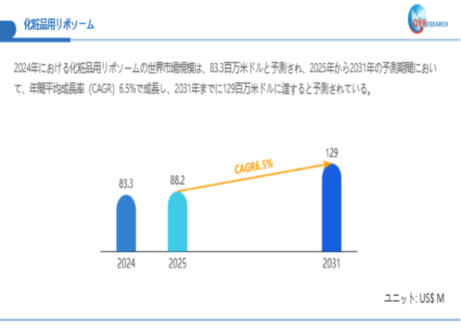 QYResearchが最新発表した「化粧品用リポソーム―グローバル市場シェアとランキング、全体の売上と需要予測、2026~2032」市場調査報告書によると、世界化粧品用リポソーム市場規模は2024年の約83.3百万米ドルから2025年には88.2百万米ドルへ着実に成長し、予測期間中に6.5%の複合年間成長率(CAGR)で拡大を続け、 2031年には129百万米ドルに達する見込みである。
