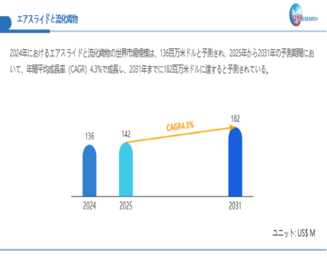 QYResearchが最新発表した「エアスライドと流化織物―グローバル市場シェアとランキング、全体の売上と需要予測、2026~2032」市場調査報告書によると、世界エアスライドと流化織物市場規模は2024年の約136百万米ドルから2025年には142百万米ドルへ着実に成長し、予測期間中に4.3%の複合年間成長率(CAGR)で拡大を続け、2031年には182百万米ドルに達する見込みである。