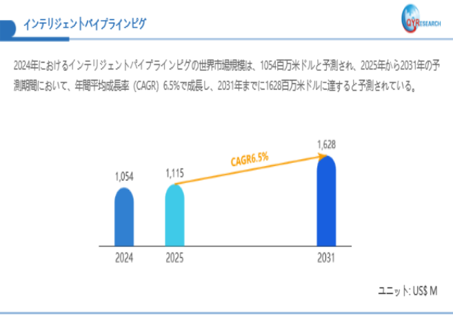 QYResearchが最新発表した「インテリジェントパイプラインピグ―グローバル市場シェアとランキング、全体の売上と需要予測、2026~2032」市場調査報告書によると、世界インテリジェントパイプラインピグ市場規模は2024年の約1054百万米ドルから2025年には1115百万米ドルへ着実に成長し、予測期間中に6.5%の複合年間成長率(CAGR)で拡大を続け、2031年には1628百万米ドルに達する見込みである。