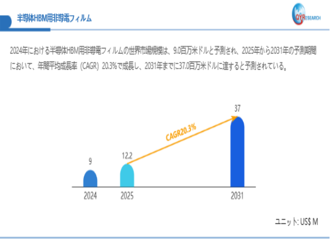 QYResearchが最新発表した「半導体HBM用非導電フィルム―グローバル市場シェアとランキング、全体の売上と需要予測、2026~2032」市場調査報告書によると、世界半導体HBM用非導電フィルム市場規模は2024年の約9百万米ドルから2025年には12.2百万米ドルへ着実に成長し、予測期間中に20.3%の複合年間成長率(CAGR)で拡大を続け、2031年には37百万米ドルに達する見込みである。