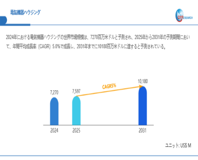 QYResearchが最新発表した「電気機器ハウジング―グローバル市場シェアとランキング、全体の売上と需要予測、2026~2032」市場調査報告書によると、世界電気機器ハウジング市場規模は2024年の約7270百万米ドルから2025年には7597百万米ドルへ着実に成長し、予測期間中に5%の複合年間成長率(CAGR)で拡大を続け、2031年には10180百万米ドルに達する見込みである。