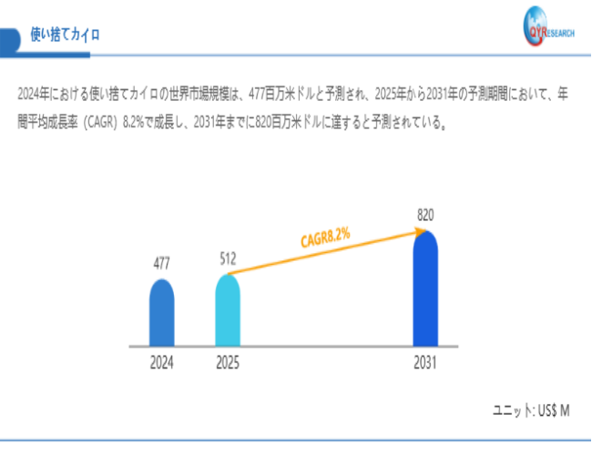 QYResearchが最新発表した「使い捨てカイロ―グローバル市場シェアとランキング、全体の売上と需要予測、2026~2032」市場調査報告書によると、世界使い捨てカイロ市場規模は2024年の約477百万米ドルから2025年には512百万米ドルへ着実に成長し、予測期間中に8.2%の複合年間成長率(CAGR)で拡大を続け、2031年には820百万米ドルに達する見込みである。