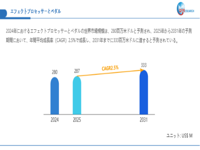 QYResearchが最新発表した「エフェクトプロセッサーとペダル―グローバル市場シェアとランキング、全体の売上と需要予測、2026~2032」市場調査報告書によると、世界エフェクトプロセッサーとペダル市場規模は2024年の約280百万米ドルから2025年には287百万米ドルへ着実に成長し、予測期間中に2.5%の複合年間成長率(CAGR)で拡大を続け、2031年には333百万米ドルに達する見込みである。