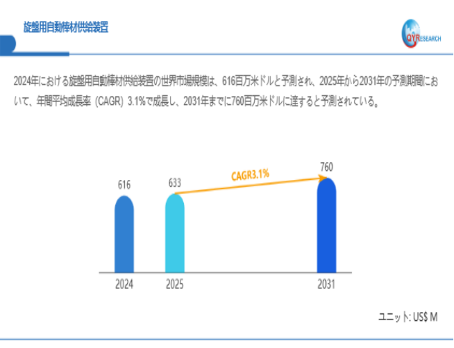 QYResearchが最新発表した「旋盤用自動棒材供給装置―グローバル市場シェアとランキング、全体の売上と需要予測、2026~2032」市場調査報告書によると、世界旋盤用自動棒材供給装置市場規模は2024年の約616百万米ドルから2025年には633百万米ドルへ着実に成長し、予測期間中に3.1%の複合年間成長率(CAGR)で拡大を続け、2031年には760百万米ドルに達する見込みである。