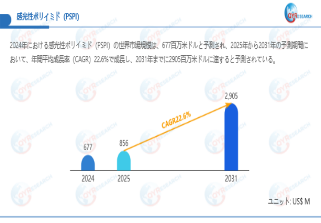 QYResearchが最新発表した「感光性ポリイミド(PSPI)―グローバル市場シェアとランキング、全体の売上と需要予測、2026~2032」市場調査報告書によると、世界感光性ポリイミド(PSPI)市場規模は2024年の約677百万米ドルから2025年には856百万米ドルへ着実に成長し、予測期間中に22.6%の複合年間成長率(CAGR)で拡大を続け、2031年には2905百万米ドルに達する見込みである。