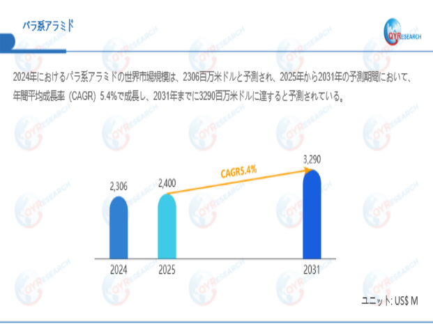 QYResearchが最新発表した「パラ系アラミド―グローバル市場シェアとランキング、全体の売上と需要予測、2026~2032」市場調査報告書によると、世界パラ系アラミド市場規模は2024年の約2306百万米ドルから2025年には2400百万米ドルへ着実に成長し、予測期間中に5.4%の複合年間成長率(CAGR)で拡大を続け、2031年には3290百万米ドルに達する見込みである。