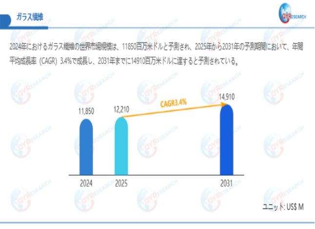 QYResearchが最新発表した「ガラス繊維―グローバル市場シェアとランキング、全体の売上と需要予測、2026~2032」市場調査報告書によると、世界ガラス繊維市場規模は2024年の約11850百万米ドルから2025年には12210百万米ドルへ着実に成長し、予測期間中に3.4%の複合年間成長率(CAGR)で拡大を続け、2031年には14910百万米ドルに達する見込みである。