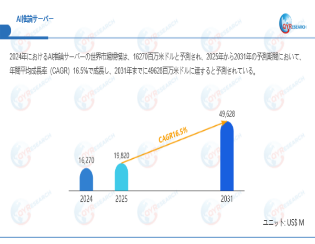 QYResearchが最新発表した「AI推論サーバー―グローバル市場シェアとランキング、全体の売上と需要予測、2026~2032」市場調査報告書によると、世界AI推論サーバー市場規模は2024年の約16270百万米ドルから2025年には19820百万米ドルへ着実に成長し、予測期間中に16.5%の複合年間成長率(CAGR)で拡大を続け、2031年には49628百万米ドルに達する見込みである。