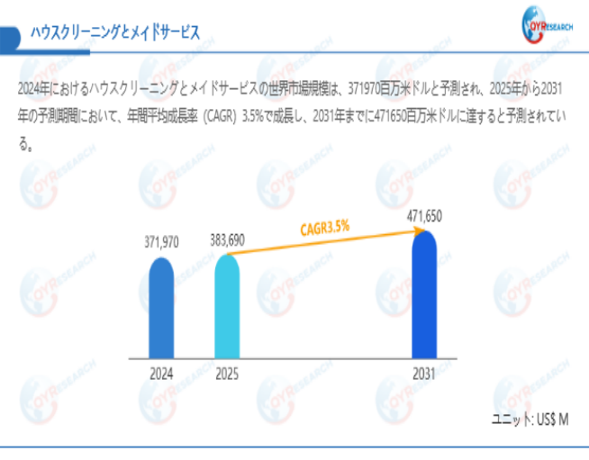 QYResearchが最新発表した「ハウスクリーニングとメイドサービス―グローバル市場シェアとランキング、全体の売上と需要予測、2026~2032」市場調査報告書によると、世界ハウスクリーニングとメイドサービス市場規模は2024年の約371970百万米ドルから2025年には383690百万米ドルへ着実に成長し、予測期間中に3.5%の複合年間成長率(CAGR)で拡大を続け、2031年には471650百万米ドルに達する見込みである。