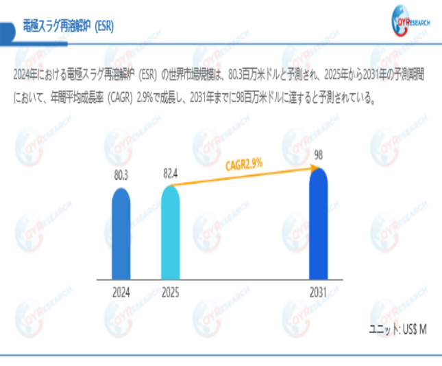 QYResearchが最新発表した「電極スラグ再溶解炉(ESR)―グローバル市場シェアとランキング、全体の売上と需要予測、2026~2032」市場調査報告書によると、世界電極スラグ再溶解炉(ESR)市場規模は2024年の約80.3百万米ドルから2025年には82.4百万米ドルへ着実に成長し、予測期間中に2.9%の複合年間成長率(CAGR)で拡大を続け、2031年には98百万米ドルに達する見込みである。