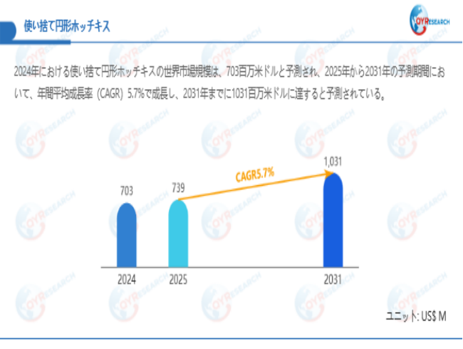 QYResearchが最新発表した「使い捨て円形ホッチキス―グローバル市場シェアとランキング、全体の売上と需要予測、2026~2032」市場調査報告書によると、世界使い捨て円形ホッチキス市場規模は2024年の約703百万米ドルから2025年には739百万米ドルへ着実に成長し、予測期間中に5.7%の複合年間成長率(CAGR)で拡大を続け、2031年には1031百万米ドルに達する見込みである。