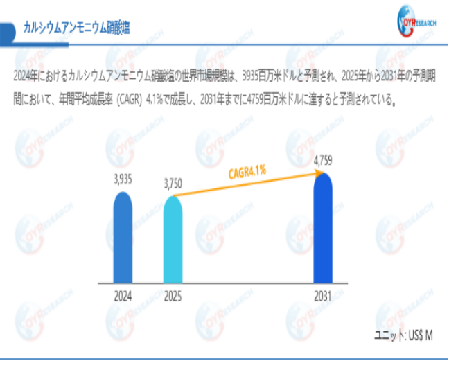 QYResearchが最新発表した「カルシウムアンモニウム硝酸塩―グローバル市場シェアとランキング、全体の売上と需要予測、2026~2032」市場調査報告書によると、世界カルシウムアンモニウム硝酸塩市場規模は2024年の約3935百万米ドルから2025年には3750百万米ドルへ着実に成長し、予測期間中に4.1%の複合年間成長率(CAGR)で拡大を続け、2031年には4759百万米ドルに達する見込みである。