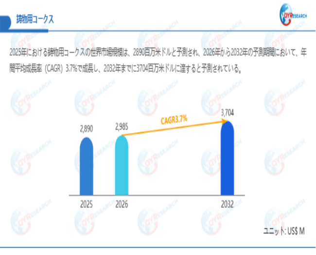 QYResearchが最新発表した「鋳物用コークス―グローバル市場シェアとランキング、全体の売上と需要予測、2026~2032」市場調査報告書によると、世界鋳物用コークス市場規模は2025年の約2890百万米ドルから2026年には2985百万米ドルへ着実に成長し、予測期間中に3.7%の複合年間成長率(CAGR)で拡大を続け、2032年には3704百万米ドルに達する見込みである。