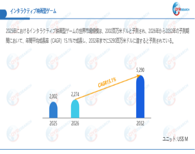 QYResearchが最新発表した「インタラクティブ映画型ゲーム―グローバル市場シェアとランキング、全体の売上と需要予測、2026~2032」市場調査報告書によると、世界インタラクティブ映画型ゲーム市場規模は2025年の約2002百万米ドルから2026年には2274百万米ドルへ着実に成長し、予測期間中に15.1%の複合年間成長率(CAGR)で拡大を続け、2032年には5290百万米ドルに達する見込みである。