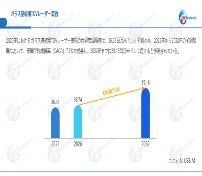 QYResearchが最新発表した「ガラス基板用TGVレーザー装置―グローバル市場シェアとランキング、全体の売上と需要予測、2026~2032」市場調査報告書によると、世界ガラス基板用TGVレーザー装置市場規模は2025年の約36.35百万米ドルから2026年には38.74百万米ドルへ着実に成長し、予測期間中に7.3%の複合年間成長率(CAGR)で拡大を続け、2032年には59.16百万米ドルに達する見込みである。