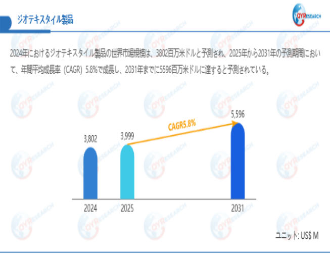 QYResearchが最新発表した「ジオテキスタイル製品―グローバル市場シェアとランキング、全体の売上と需要予測、2026~2032」市場調査報告書によると、世界ジオテキスタイル製品市場規模は2024年の約3802百万米ドルから2025年には3999百万米ドルへ着実に成長し、予測期間中に5.8%の複合年間成長率(CAGR)で拡大を続け、2031年には5596百万米ドルに達する見込みである。