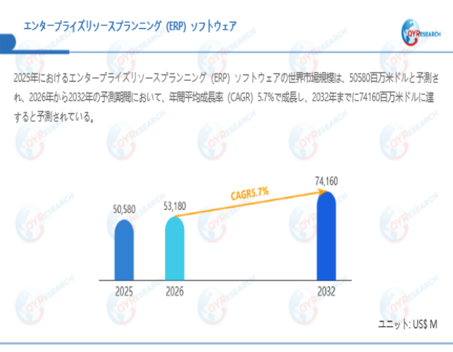 QYResearchが最新発表した「エンタープライズリソースプランニング(ERP)ソフトウェア―グローバル市場シェアとランキング、全体の売上と需要予測、2026~2032」市場調査報告書によると、世界エンタープライズリソースプランニング(ERP)ソフトウェア市場規模は2025年の約50580百万米ドルから2026年には53180百万米ドルへ着実に成長し、予測期間中に5.7%の複合年間成長率(CAGR)で拡大を続け、2032年には74160百万米ドルに達する見込みである。