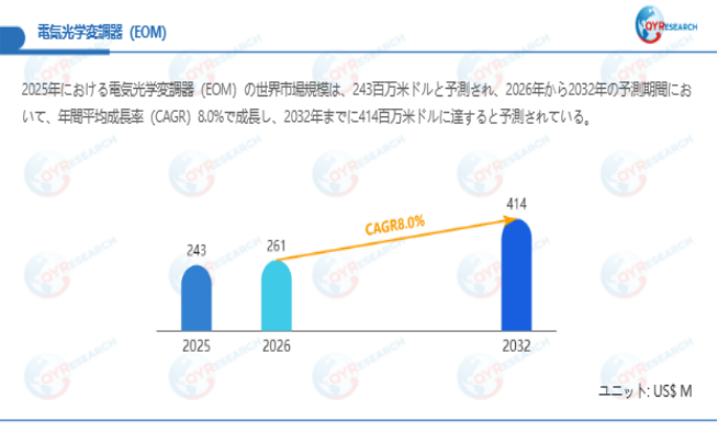 電気光学変調器(EOM)は、光通信、量子技術、精密計測など高度光システムにおいて光波の位相、強度、偏光を電気信号で精密制御する核心部品である。QYResearchが最新発表した「電気光学変調器(EOM)―グローバル市場シェアとランキング、全体の売上と需要予測、2026~2032」市場調査報告書によると、世界電気光学変調器(EOM)市場規模は2025年の約243百万米ドルから2026年には261百万米ドルへ着実に成長し、予測期間中に8%の複合年間成長率(CAGR)で拡大を続け、2032年に414百万米ドルに達する見込みである。