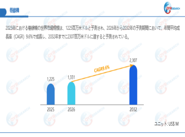QYResearchが最新発表した「巻線機―グローバル市場シェアとランキング、全体の売上と需要予測、2026~2032」市場調査報告書によると、世界巻線機市場規模は2025年の約1225百万米ドルから2026年には1331百万米ドルへ着実に成長し、予測期間中に9.6%の複合年間成長率(CAGR)で拡大を続け、2032年に2307百万米ドルに達する見込みである。