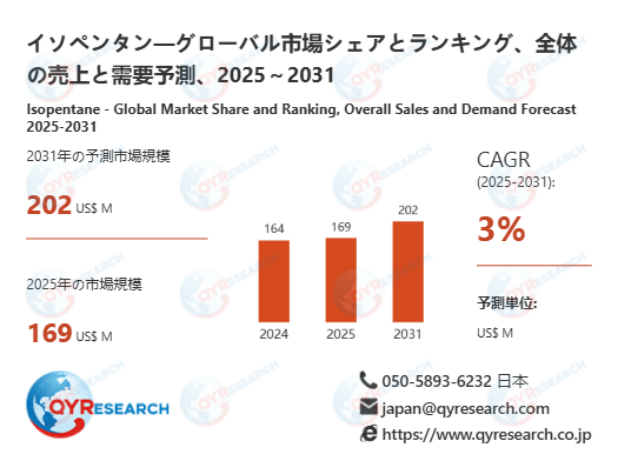 QYResearchが最新発表した「イソペンタン―グローバル市場シェアとランキング、全体の売上と需要予測、2025~2031」市場調査報告書によると、世界イソペンタン市場規模は2024年の約164百万米ドルから2025年には169百万米ドルへ着実に成長し、予測期間中に3%の複合年間成長率(CAGR)で拡大を続け、2031年に202百万米ドルに達する見込みである。